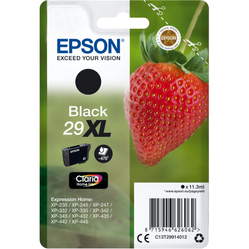 Epson Strawberry C13T29914012. Rašalo kasetės tipas: Didelė (XL) išeiga, Juodo rašalo tipas: Pigmento pagrindo rašalas, Juodo rašalo kiekis: 11,3 ml, Spausdinimo spalvos: Juoda, Kiekis pakuotėje: 1 vnt, Juodo rašalo puslapio išeiga: 470 puslapiai