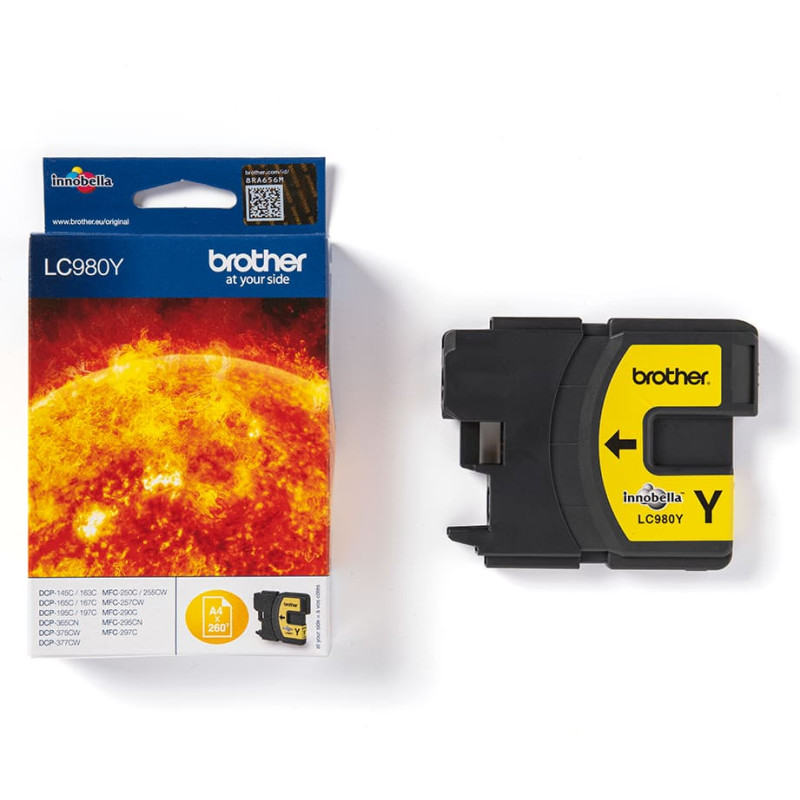 Brother LC-980Y. Spalvoto rašalo tipas: Pigmento pagrindo rašalas, Tiekimo tipas: Vienguba pakuotė, Spausdinimo spalvos: Geltona, Kiekis pakuotėje: 1 vnt