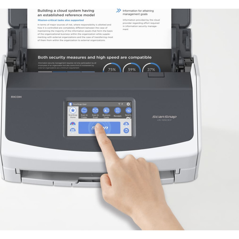 Ricoh ScanSnap iX1600. Maksimalus skanavimo dydis: 216 x 360 mm, Optinė nuskaitymo skiriamoji geba: 600 x 600 DPI, ADF skenavimo sparta (nespalvotas, A4): 40 ppm. Skenerio tipas: ADF + mechaninio padavimo skeneris, Produkto spalva: Balta, Ekranas: TFT. Jutiklio tipas: Colour CIS, Šviesos šaltinis: RGB LED, Ieškomų failų formatai: JPG, PDF. Įprasta įėjimo apimtis: 50 lapai. Didžiausias ISO A serijos popieriaus dydis: A4, Palaikomas skenavimo medijos tipas: Vizitinė kortelė, Post Card(JPN), ISO A-serijos dydžiai (A0...A9): A3, A4, A5