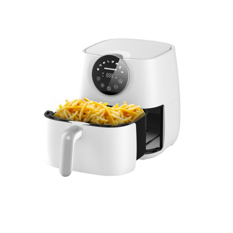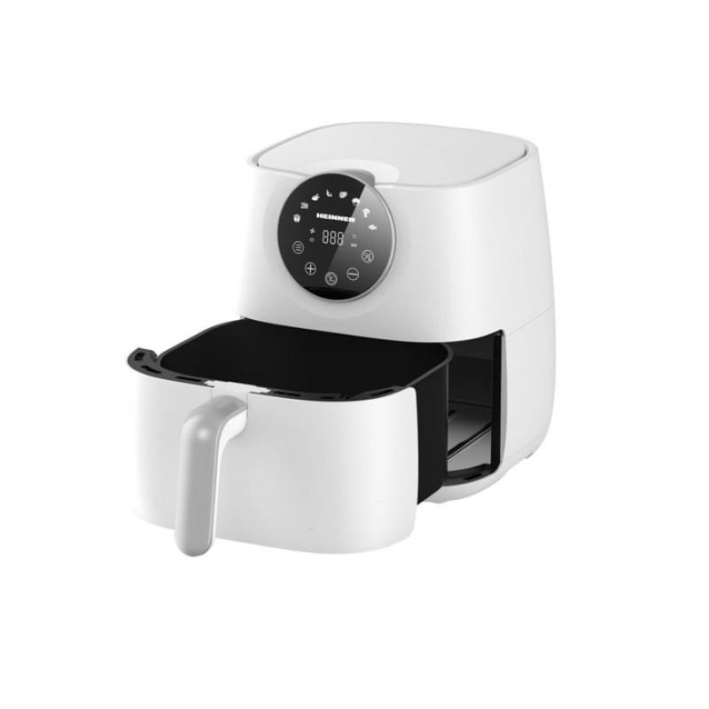 Karšto oro gruzdintuvė Heinner SmartFry HAF-B6WH1700, 1700W, talpa: 5.7L, skaitmeninis ekranas su lietimui jautriu valdymu, laikmatis: iki 60 min, temperatūros diapazonas: 80-200°C, 8 iš anksto nustatytos programos, nuimamas krepšelis, automatinis išjungimas, neslidžios kojelės, balta spalva