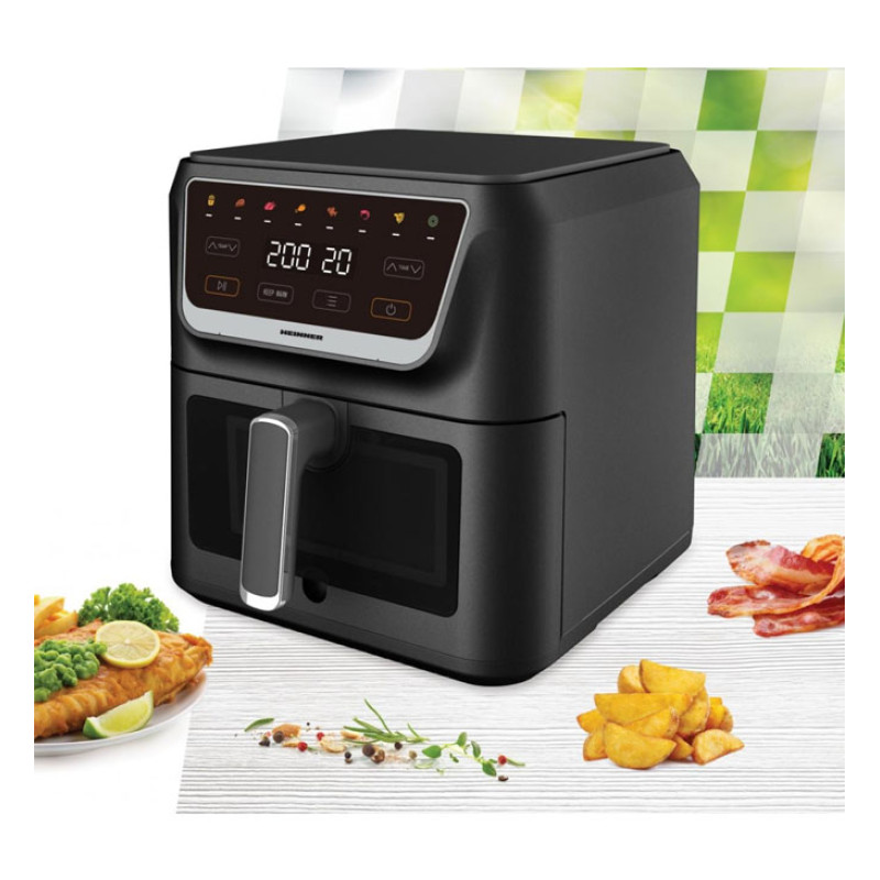 Karšto oro keptuvė Heinner HAF-H8BK1700, 1700 W galia, 8 l talpa, skaitmeninis ekranas ir jutiklinis valdymas, 8 iš anksto nustatyti programos, 80–200 °C temperatūra, permatomas langelis, automatinis išjungimas, nelipni danga ir kepimo skarda, juoda spalva.