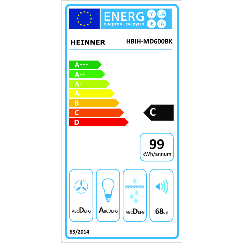 Įmontuojama gartraukio gaubtas Heinner HBIH-MD600BK, 60 cm, maksimali absorbcijos galia: 610 m³/h, 3 greičio nustatymai, variklis: 1 × 215 W, LED apšvietimas: 2 × 1,5 W, 1 aliuminis filtras, išmetimo vamzdžio skersmuo: 150 mm, matmenys (ilgis × plotis × aukštis): 52 × 28,4 × 29,9 cm, juodos spalvos.