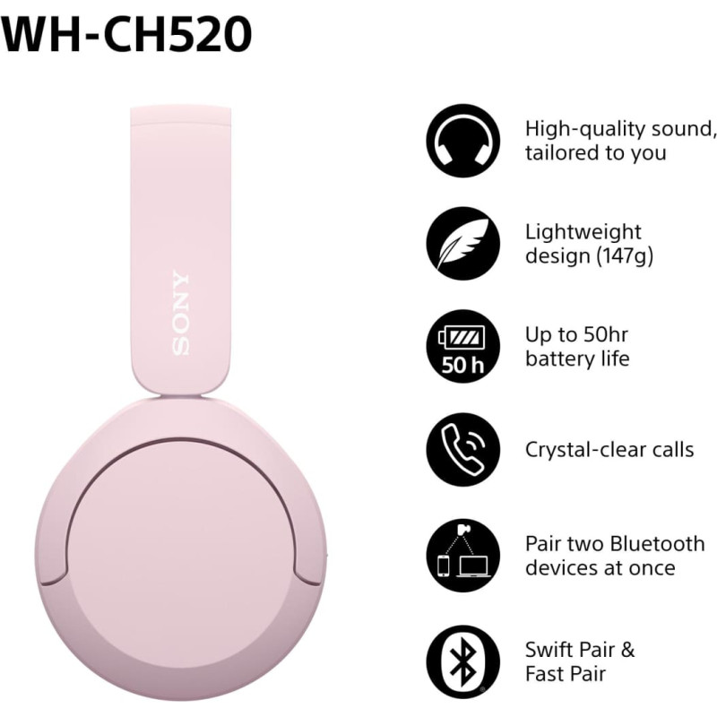 Sony WHCH520P.CE7 Ausinės be mikrofono ir ausinės su mikrofonu Laisvų rankų įranga Bevielis Su lankeliu Skambučiai / muzika C tipo USB Bluetooth Rožinė
