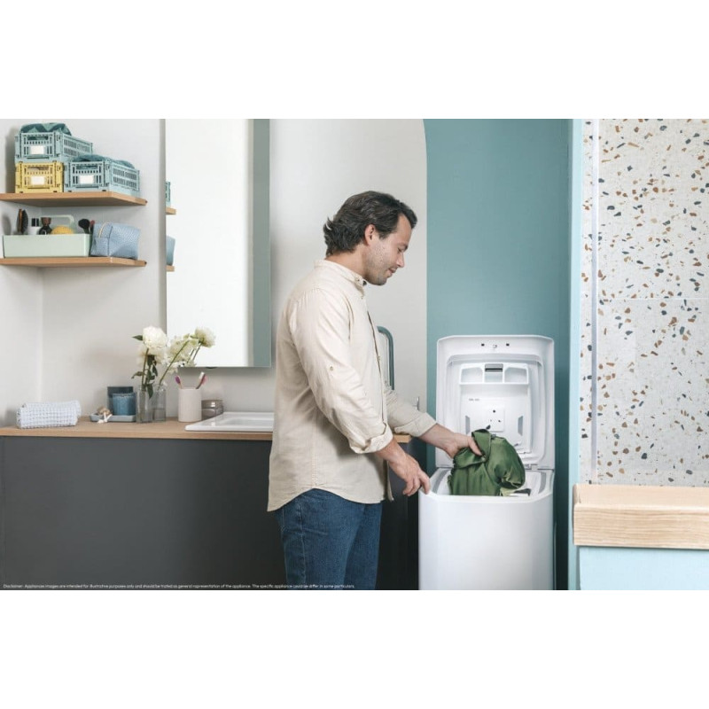 Candy TCAS265D3-S. Pakrovimo tipas: Pakraunama iš viršaus. Vardinė talpa: 6 kg, Gręžimo - džiovinimo kategorija: B, Triukšmo lygis (sukimas): 79 dB, Maksimalus apsisukimų greitis: 1200 RPM. Produkto spalva: Balta. Plotis: 410 mm, Ilgis: 600 mm, Aukštis: 860 mm. Energijos efektyvumo klasė: C