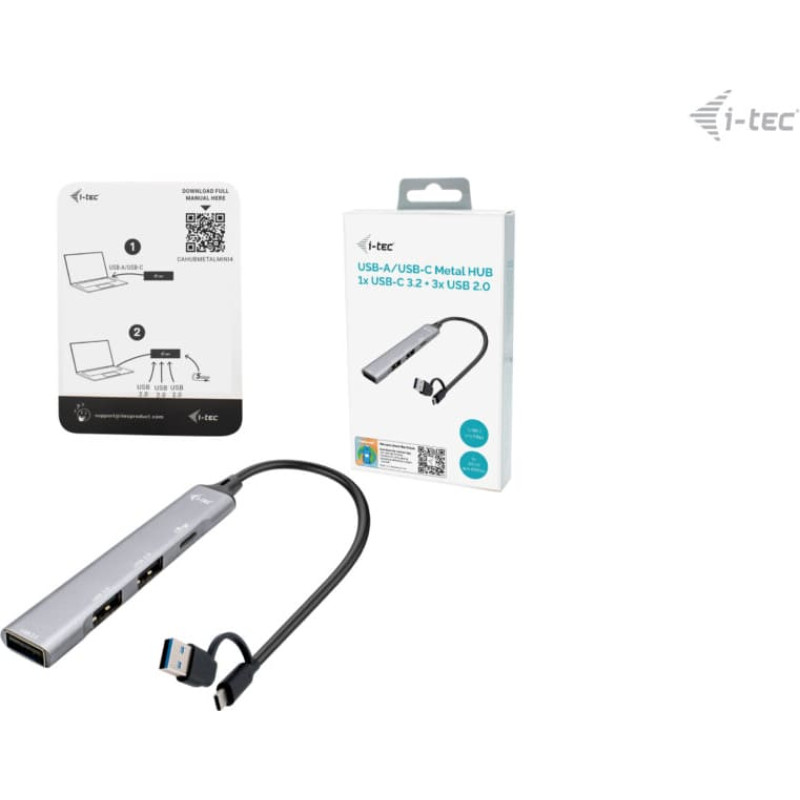 i-tec CAHUBMETALMINI4. Priimančioji sąsaja: USB 3.2 Gen 1 (3.1 Gen 1) Type-A + Type-C, Lizdo sąsajos: USB 2.0, C tipo USB. Duomenų perdavimo sparta: 5000 Mbit/ai, Produkto spalva: Sidabras. Kitos palaikomos operacinės sistemos: Android, ChromeOS. Plotis: 100 mm, Ilgis: 17 mm, Aukštis: 7 mm. Kiekis pakuotėje: 1 vnt, Pakuotės tipas: Pakabinama dėžutė