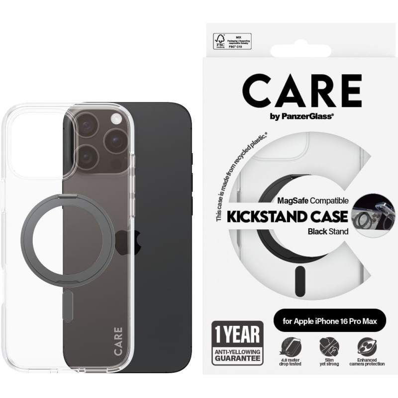 PanzerGlass CARE by ® Feature Case Transparent w. Black Kickstand & MagSafe iPhone 16 Pro Max. Dėklo tipas: Dėklas, Modelio suderinamumas: Apple, Suderinamumas: Apple - iPhone 16 Pro Max, Produkto spalva: Permatomas