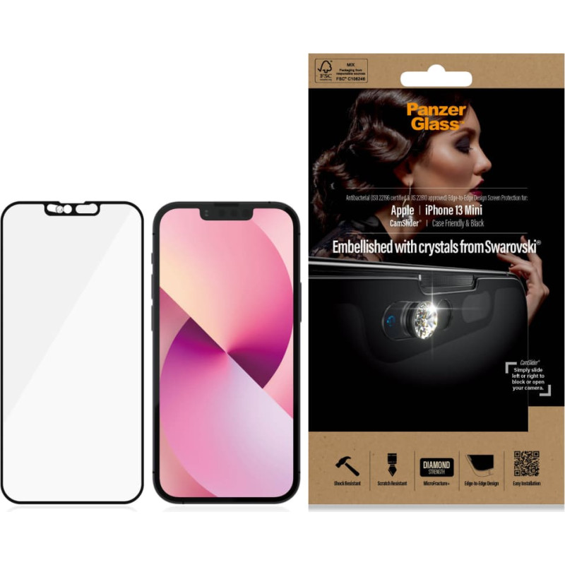 PanzerGlass 2750. Modelio suderinamumas: Apple, Suderinamumas: Apple - iPhone 13 Mini. Sausas naudojimas. Apsaugos ypatybės: Atsparus įbrėžimams, Atsparus smūgiams, Antibakterinis. Medžiaga: Grūdintas stiklas, Polietileno tereftalatas (PET), Produkto spalva: Permatomas. Kiekis pakuotėje: 1 vnt