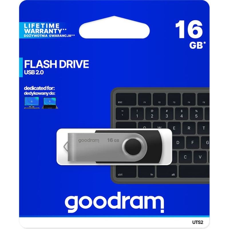 Goodram UTS2. Pajėgumas: 16 GB, Įrenginio sąsaja: USB A tipo, USB versija: 2.0, Skaitymo laikas: 20 MB/s, Rašymo laikas: 5 MB/s. Forma: Sukutis. Svoris: 15 g. Produkto spalva: Juoda