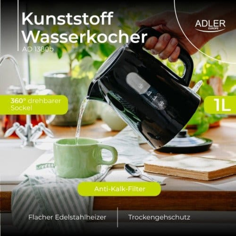 Adler Kettle | AD 1380b | Electric | 2200 W | 1 L | Polypropylene | 360° rotational base | Black