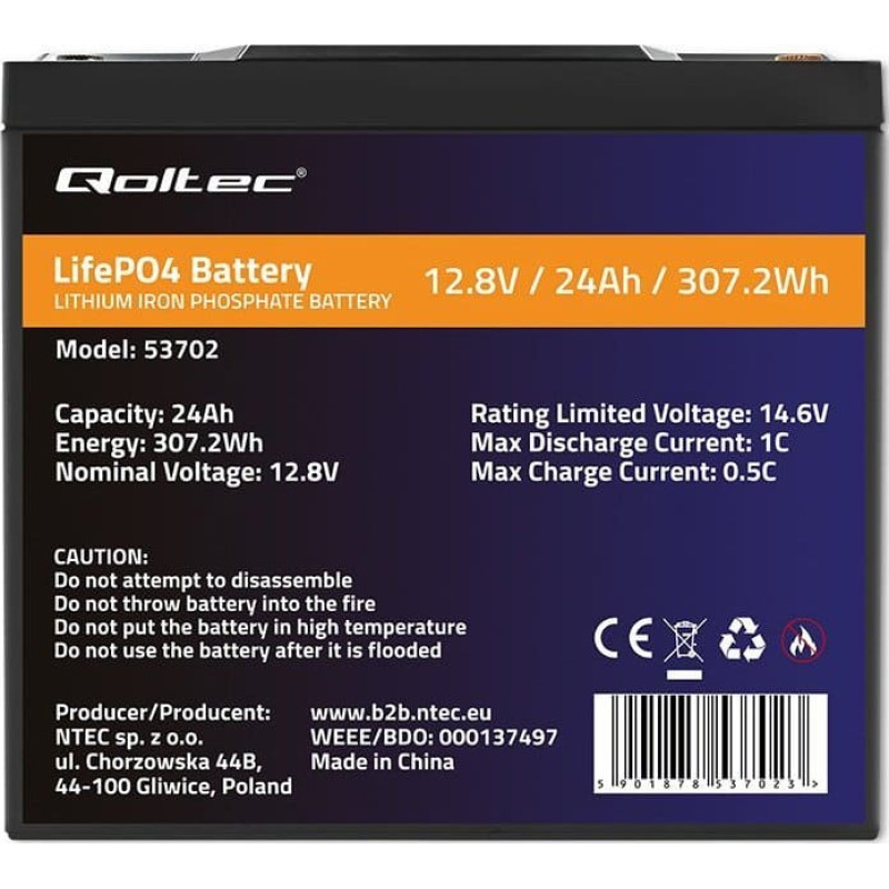 Qoltec Akumulator LiFePO4 Litowo-Żelazowo-Fosforanowy | 12.8V | 24Ah | 307.2Wh | BMS