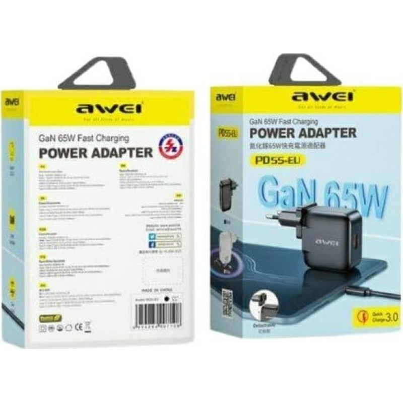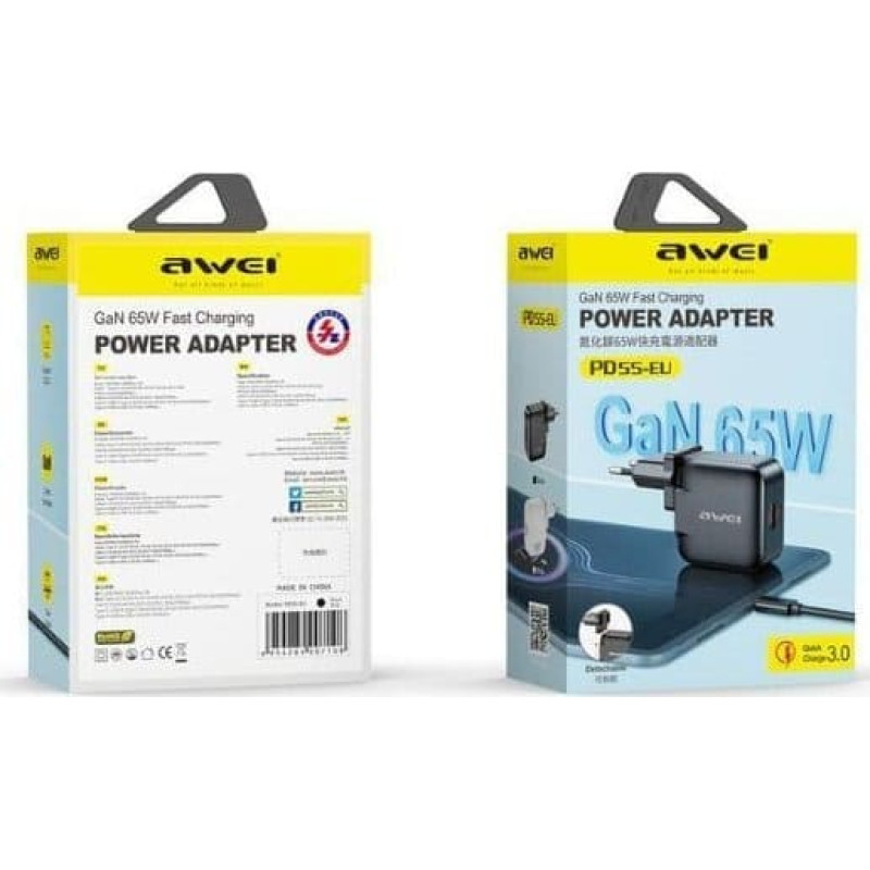 Awei Ładowarka Awei AWEI ład. siec. PD55-EU 65W USB + USB-C czarna/black GaN
