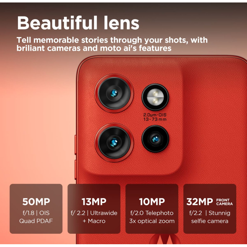 Motorola edge 50 Neo . Ekrano įstrižainė: 16,1 cm (6.36"), Ekrano rezoliucija: 2670 x 1220 pikseliai. Procesoriaus šeima: MediaTek, Procesoriaus modelis: 7300. RAM talpa: 12 GB, RAM tipas: LPDDR4X, Vidinės saugyklos talpa: 512 GB. Galinės kameros rezoliucija (skaitmeninė): 50 MP, Galinės kameros tipas: Trigubas fotoaparatas. Vietos SIM kortelėms: Dviguba SIM jungtis. Numatyta operacinė sistema: Android 14. Baterijos talpa: 4310 mAh. Produkto spalva: Raudona. Svoris: 171 g