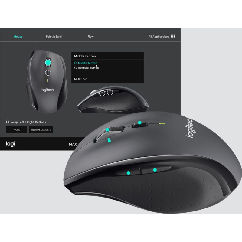 Logitech Customizable Mouse M705. Forma: Dešinės rankos. Judėjimo detekcijos technologija: Optinis, Įrenginio sąsaja: Radijo dažnio belaidė, Judėjimo rezoliucija: 1000 DPI, Mygtukų tipas: Paspausti mygtukai, Mygtukų kiekis: 5, Slinkties tipas: Ratukas. Maitinimo šaltinis: Baterijos. Produkto spalva: Anglies