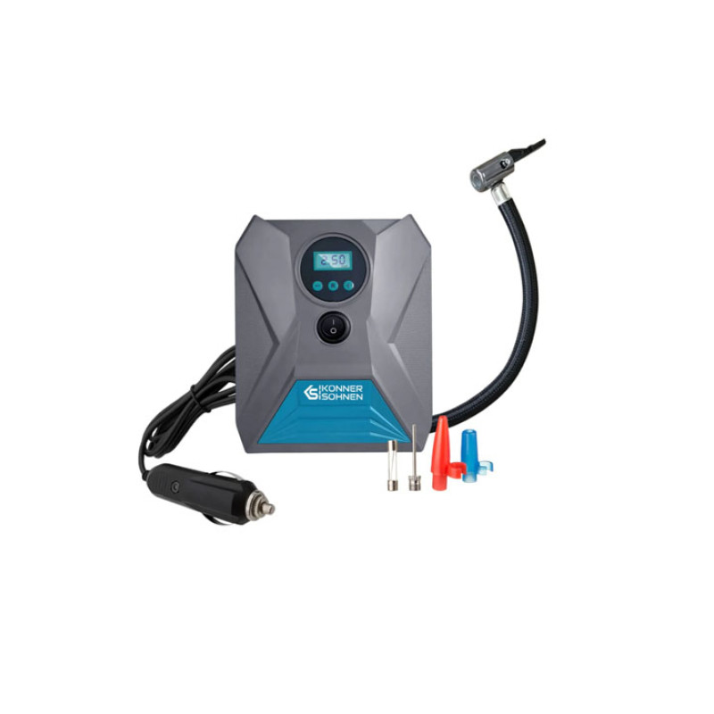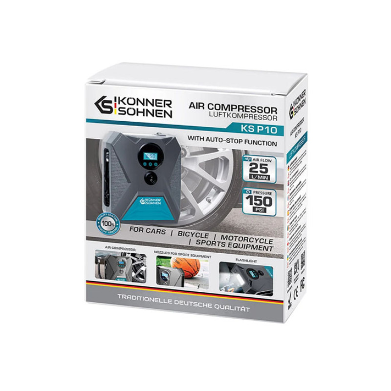 Könner & Söhnen® automobiliniai kompresoriai KS P10 - tai universalus įrankis vairuotojams, dviratininkams ir dviračių sporto entuziastams, kuriuo galima greitai ir lengvai pripūsti padangas, sporto įrangą ar net plaukimo kostiumus. Užtikrindami optimalų pripūtimo slėgį, šie kompresoriai ne tik prailgina padangų tarnavimo laiką, pagerina važiavimą bekele ir sumažina degalų sąnaudas, bet ir padeda išvengti dažno padangų keitimo.