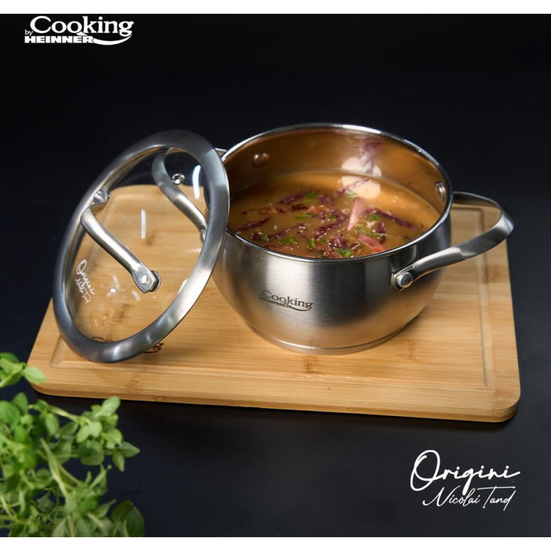 Nicolai Tand nerūdijančio plieno puodų linija sukurta tam, kad virtuvėje turėtumėte patikimą pagalbininką, nepriklausomai nuo to, ką planuojate gaminti. 5 sluoksnių kapsuliuotas dugnas tinka visų tipų viryklėms, įskaitant indukcines. Vidinė matavimo skalė leidžia patogiai nustatyti tūrį, o veidrodinio blizgesio vidus ir matinė išorė sukuria idealų produktą Jūsų virtuvei. Karščiui atsparaus stiklo dangčiai užtikrina optimalų slėgio kontrolę ir išsaugo aromatus indo viduje. Be to, bet kuris šios linijos gaminys arba visa linija yra puiki dovana bet kokiai progai, ypač įkurtuvių proga.