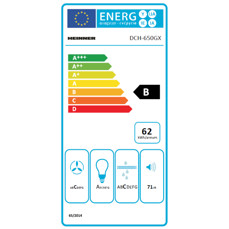 Dekoratyvus gartraukis Heinner DCH-650GX, 60cm, Dizainas "T-Shape", Maksimali siurbimo galia: 610 m3/h, 3 galios lygiai, Variklis: 1 x 190W, LED lemputė: 2 x 2W, 1 aliuminio filtras, Mygtukai, Oro išleidimo angos skersmuo: 150 mm, Matmenys (PxGxA): 60x50x(55-103) cm, Spalva: Nerūdijantis plienas + stiklas