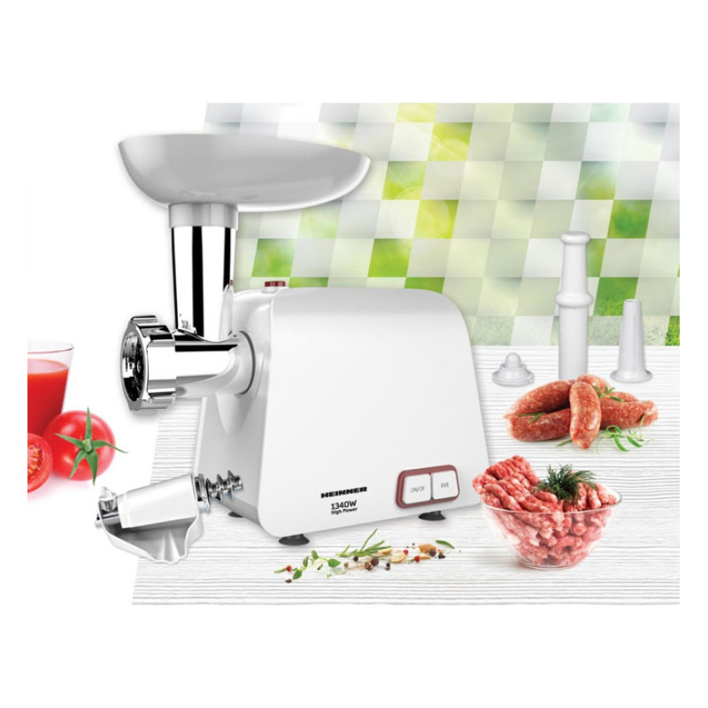 Mėsmalė Heinner Pearl 1340 MG-1340WH, 1340 W, pomidorų ir dešrų priedas, nerūdijančio plieno peiliai, „reverso“ funkcija, 2 pjaustymo plokštelės, smulkinimo našumas: 1,2 kg/min, balta