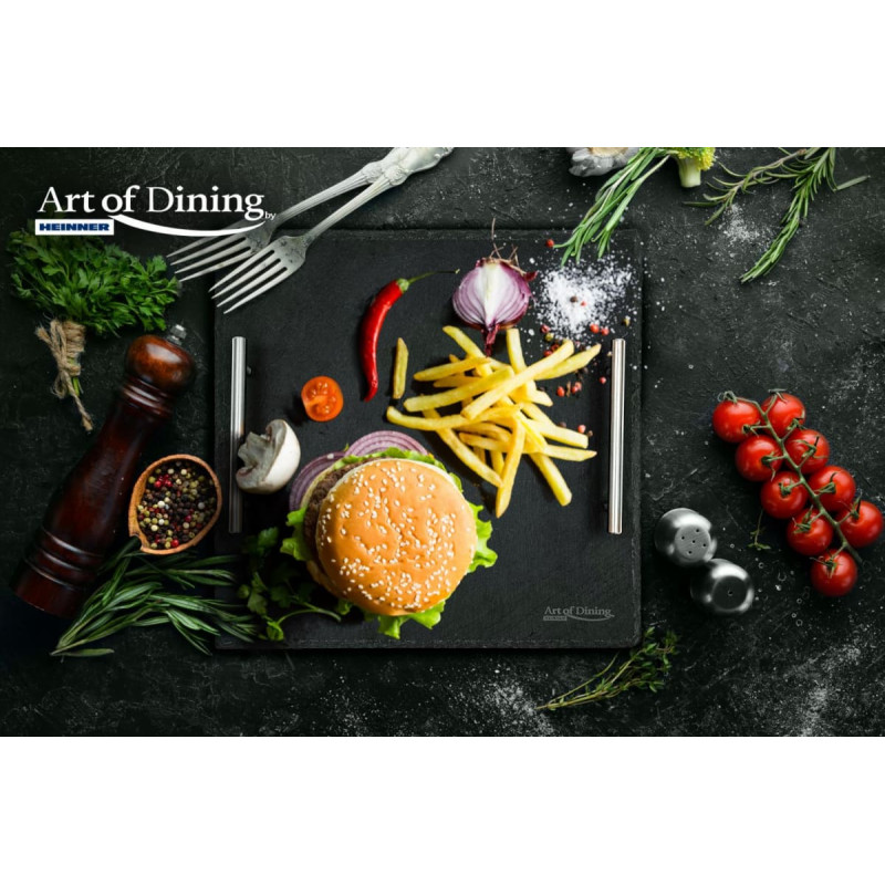 Kvadratinė serviravimo lėkštė iš skalūno su dviem nerūdijančio plieno rankenomis, skirta sūrių, užkandžių, desertų ar bendrų patiekalų pateikimui. Natūralaus akmens paviršius ir metalinės rankenos suteikia modernų bei profesionalų vaizdą ir patogų naudojimą.