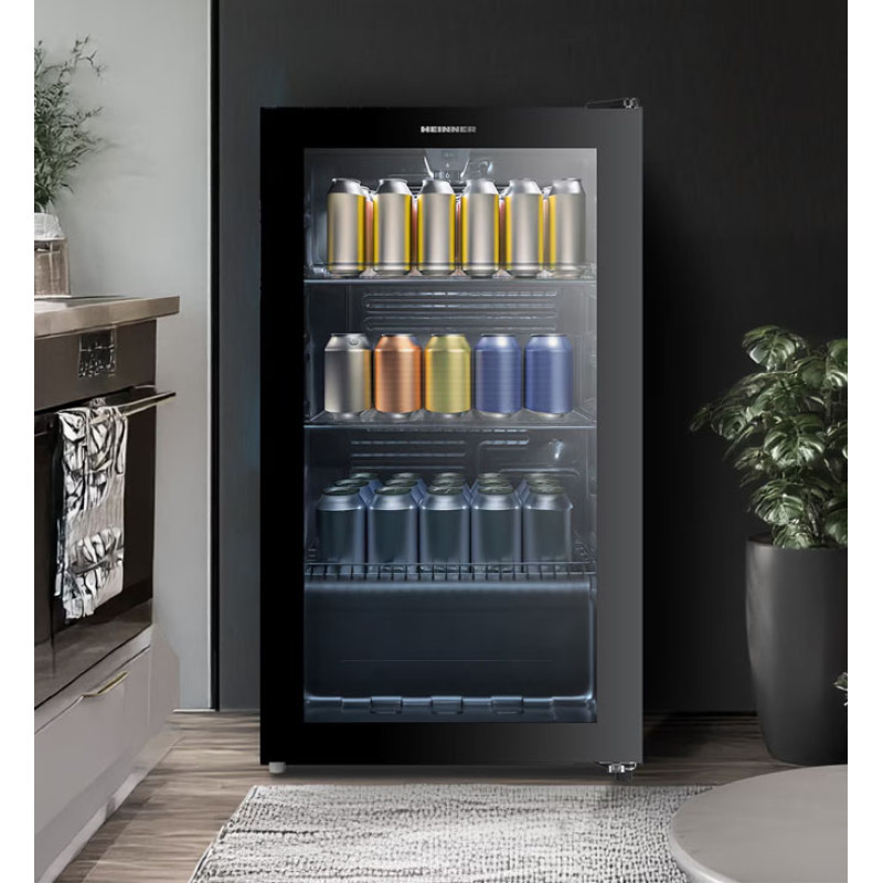 Heinner HBC-M93BKE gėrimų šaldytuvas, energijos klasė: E, bendra talpa: 93 l, talpa: 115 skardinių (355 ml), mechaninis valdymas su reguliuojamu termostatu, LED apšvietimas, 3 lentynos, apverčiamos durys, matmenys (PxGxA): 47 x 44 x 84,5 cm, spalva: juoda