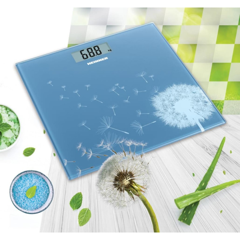 Voniai skirti svarstyklės Heinner HBS-BL150, 5 mm grūdinto stiklo paviršius, Maksimali apkrova: 150 kg, LCD ekranas, Tikslumas: 100 g, Automatinis įjungimas/išjungimas, Baterija: 1 × CR2032 (pridedama), Itin plonas ir kompaktiškas dizainas, Išmatavimai (P × G × A): 30 × 30 × 2.2 cm, Spalva: Mėlyna.