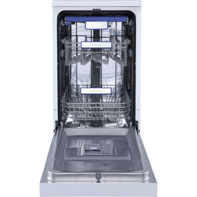 Indaplovė Heinner HDW-FSM45710AWD+++, 10 komplektų talpa, 7 programos, Automatinis durelių atidarymas, Elektroninis valdymas, LED ekranas, „Aquastop“ sistema, D klasė, Matmenys (P × G × A): 45 × 60 × 85 cm, Balta