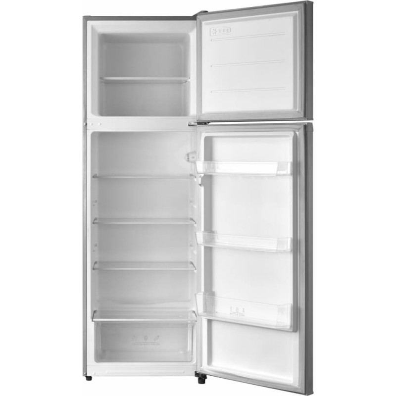 Dvivietis šaldytuvas Heinner HF-M294SE++, Energijos vartojimo efektyvumo klasė: E, Bendra talpa: 294 l (šaldytuvo – 225 l, šaldiklio – 69 l), Mechaninis valdymas su reguliuojamu termostatu, LED apšvietimas, 3 stiklinės lentynos šaldytuve, Vaisių ir daržovių skyrius, Keičiamos krypties durys, Užšaldymo našumas: 3,2 kg/24 h, Matmenys (P × G × A): 59,5 × 55 × 176 cm, Spalva: Sidabrinė