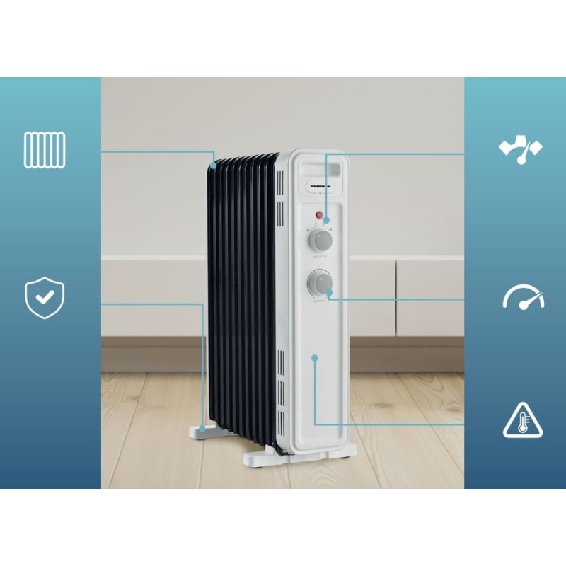 Alyvuotas radiatorius Heinner HOH-Y11WB, 11 elementų 125 x 580 mm, 3 šilumos nustatymai: 1000/1500/2500 W, apsauga nuo perkaitimo, reguliuojamas termostatas, maitinimo indikatorius, ratukai lengvam manevravimui.