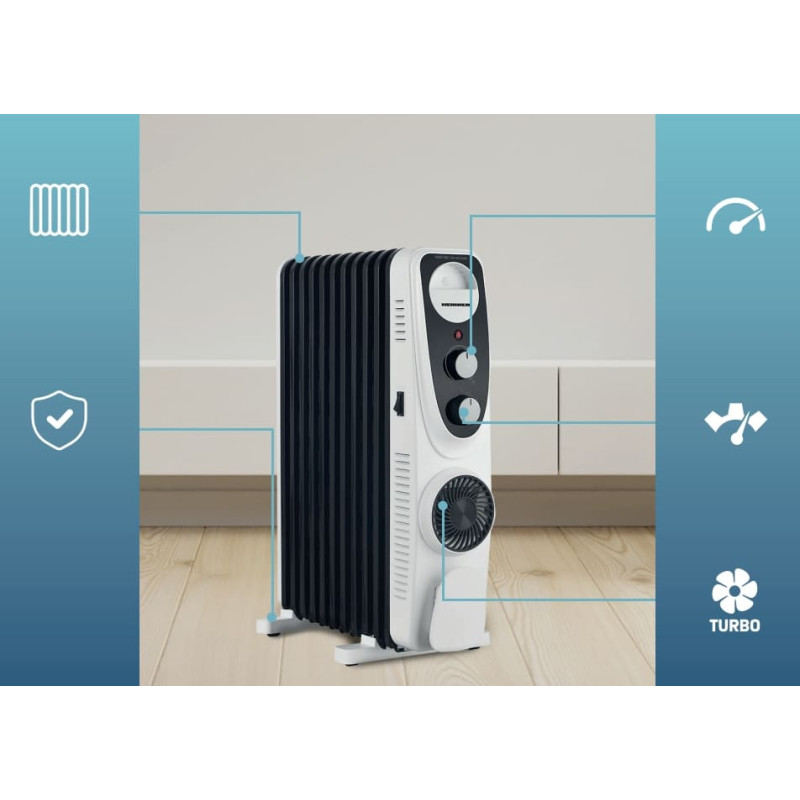 Alyvuotas radiatorius Heinner HOH-MVT11WH-BK, 2300 W, 11 elementų, turboventiliatorius, 3 šilumos nustatymai, reguliuojamas termostatas, apsauga nuo perkaitimo, baltas/juodas