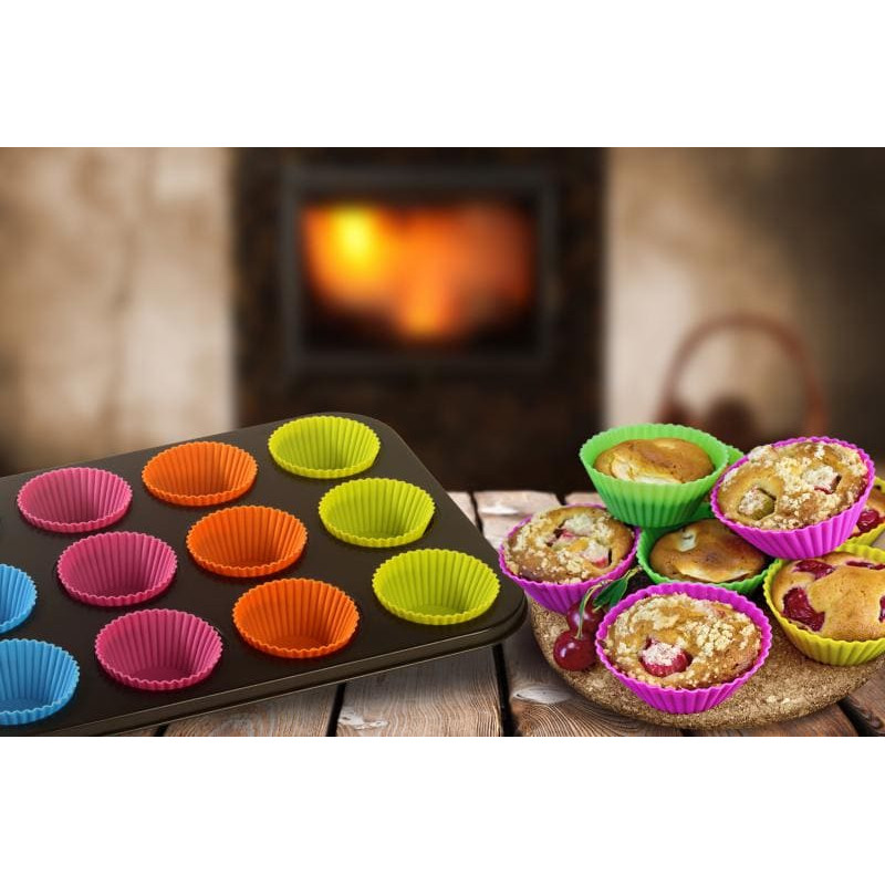 Keksiukų kepimo skarda 12 keksiukų su silikoninėmis formelėmis, pagaminta iš anglinio plieno. Nelimpanti danga užtikrina lengvą išėmimą ir tolygų kepimą.