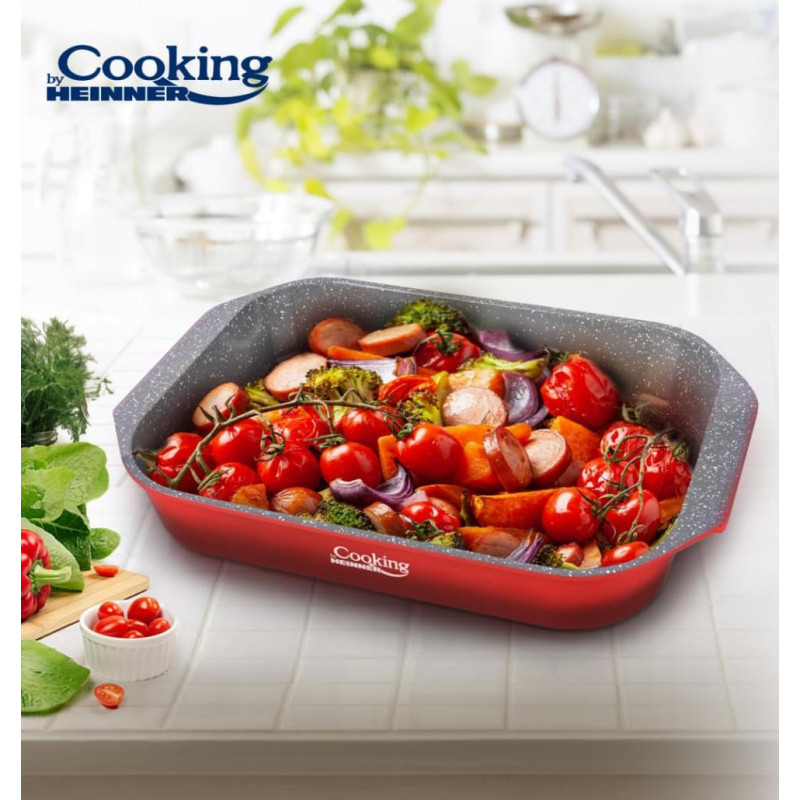 Lieto aliuminio kepimo indas su dviejų sluoksnių pilka marmuro efekto keramine vidine danga. Užtikrina tolygų karščio paskirstymą ir patikimą kepimą orkaitėje kasdieniam naudojimui.