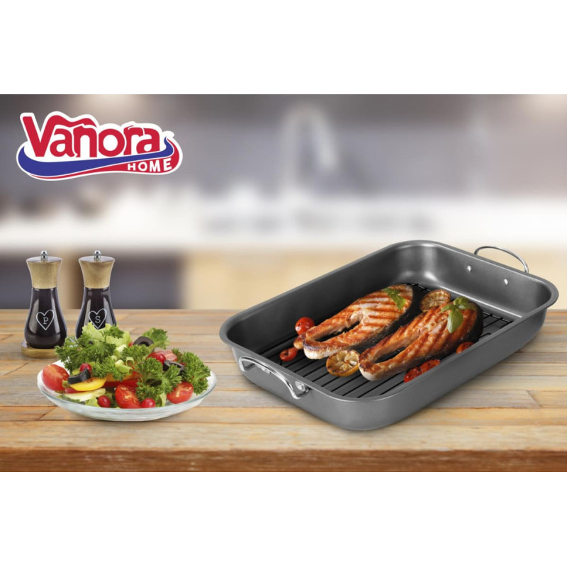 Orkaitės skarda su grotelėmis, pagaminta iš anglinio plieno, skirta kepimui, grilinimui ir skrudinimui. Nelimpanti danga užtikrina lengvą valymą, o grotelės leidžia riebalams notekėti, gaminant sveikiau.