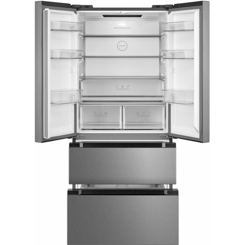 Heinner HCFD-M516INVXE++ – French Door tipo kombinuotas šaldytuvas su No Frost technologija ir inverteriniu kompresoriumi. Jis pasižymi 516 l talpa, jutikliniu LED valdymu, šviežumo palaikymo sistema ir kintamos temperatūros skyriumi.