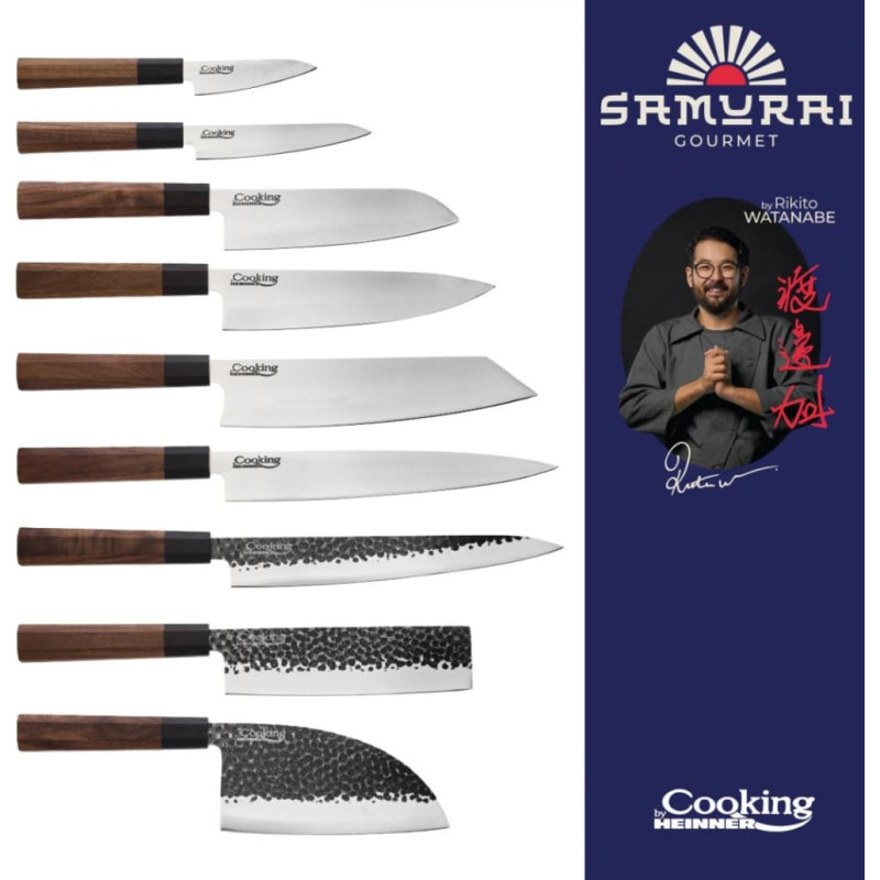 Samurai Gourmet peilių linija iš Cooking by Heinner sukurta maisto gaminimo entuziastams, vertinantiems tiek našumą, tiek estetiką. Aukštos kokybės nerūdijančio plieno geležtės užtikrina tikslius pjūvius ir ilgaamžiškumą, nepriklausomai nuo to, ar pjaustote, kapojate, ar porcijuojate.