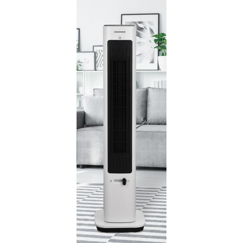 Skaitmeninis bokštinis ventiliatorius Heinner HTFA-M20WH, 2 in 1: vėsinimas/šildymas, lietimui jautrus valdymas, LED ekranas, 3 vėsinimo greičiai, 2 šildymo greičiai, ECO funkcija, 85° osciliavimo funkcija, skaitmeninis termostatas, 24h laikmatis, nuotolinio valdymo pultas, galia 2000W, vėsinimo tūris 16.7 m³/min, vėsinimo greitis 6.7 m/s, šildymo greitis 1.72 m/s, aukštis 96 cm, baltas