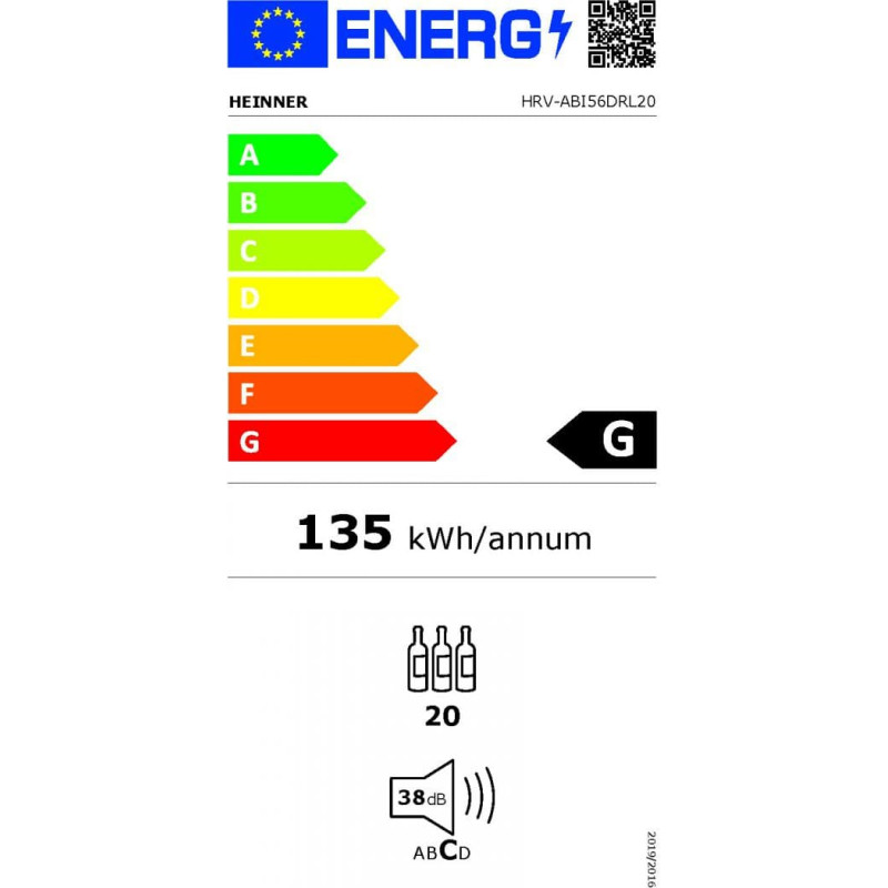 Heinner HRV-ABI56DRL20 – įmontuojama vienos zonos vyno šaldyklė, skirta iki 20 butelių laikymui. Ji turi elektroninį valdymą su LED ekranu, medines lentynas ir apverčiamas duris moderniame juodame dizaine.