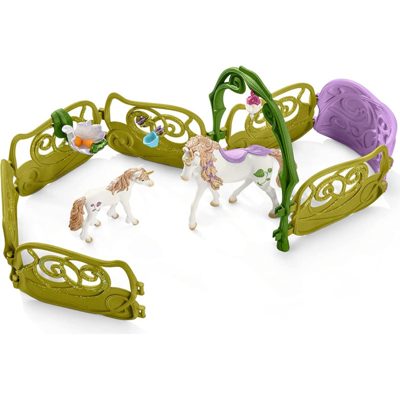 | Pakuočių kiekis | 1 x house, 1 x unicorn, 1 x unicorn foal, 1 x cloud squirrel, 1 x elf, 1 x stairs, 1 x slide, 1 x swivelling transport basket, 6 x paddocks, 1 x stable, 1 x feeding trough, 1 x lake, 1 x chest, 1 x water lily, 1 x table, 2 x chair, 2 x plate, 1 x bed, 1 x fabric duvet, 2 x plant pot, 2 x turnips, 1 x cooker, 1 x pan, 1 x dressing table with mirror, 1 x hairbrush, 4 x add-on butterfly, 4 x add-on berry, 2 x cup, 2 x flower lamp, 2 x piece of blueberry pie, 1 x cauldron, 1 x ladle, 1 x magic wand, 1 x magic potion, 1 x book, 1 x sticker sheet, 1 x assembly instructions |