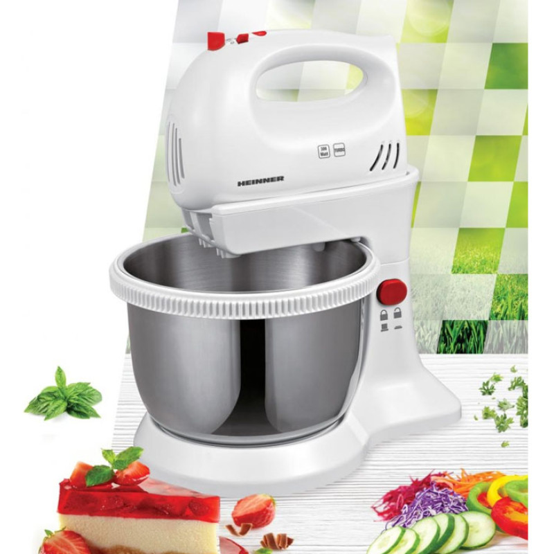 Standusis maišytuvas su dubeniu Heinner HMBR-300W, 300 W, nerūdijančio plieno, besisukančio dubens talpa: 3,4 l, 5 greičiai + Turbo, užrakto mygtukas, nerūdijančio plieno tešlos kabliukai ir plaktuvai, baltos spalvos.